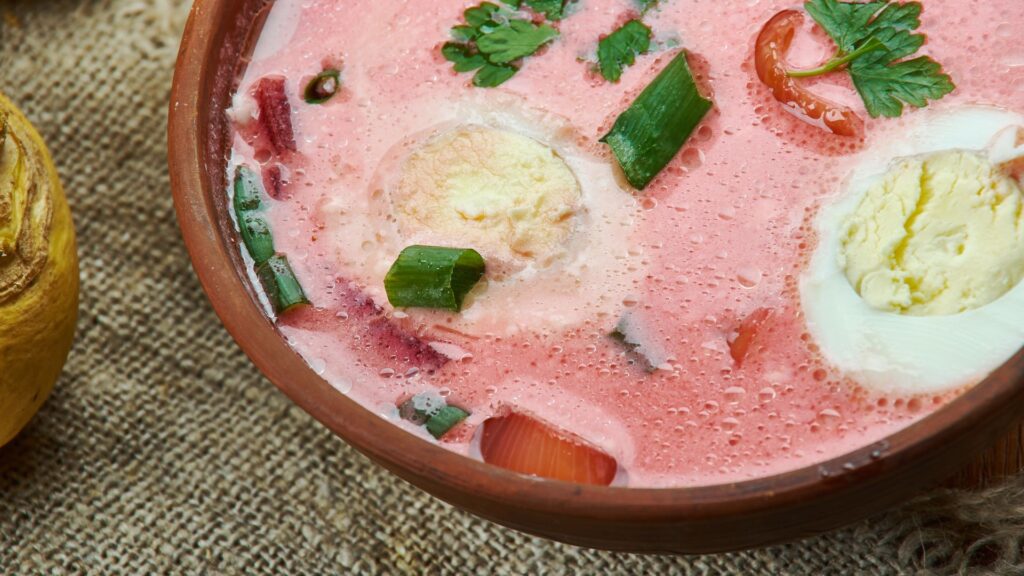 Rödbetssoppa är en färgstark och hälsosam klassiker i Lettland. Den görs på färska rödbetor, ofta kombinerade med potatis, morötter, lök och ibland surkål för att skapa en balanserad syrlig smak. Soppa kan serveras både varm och kall, beroende på säsong, och toppas ofta med gräddfil eller dill för att förhöja aromen. Den knallröda färgen gör den visuellt inbjudande och den jordnära smaken är typisk för baltiska kökets robusta råvaror.