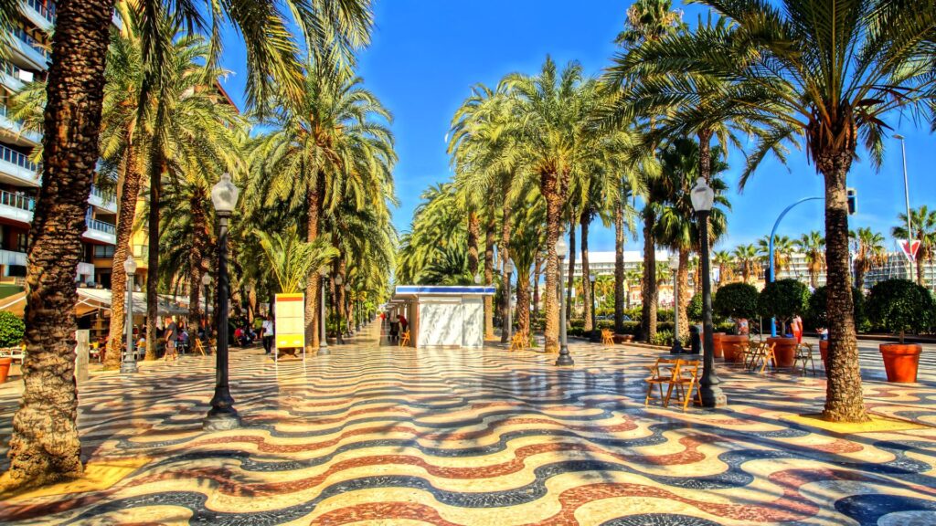 Den vackra strandpromenaden kantad av palmer och mosaikmönstrad sten, en symbol för Alicante. Här flanerar både lokalbor och besökare, njuter av glass, gatukonst och utsikten över havet.