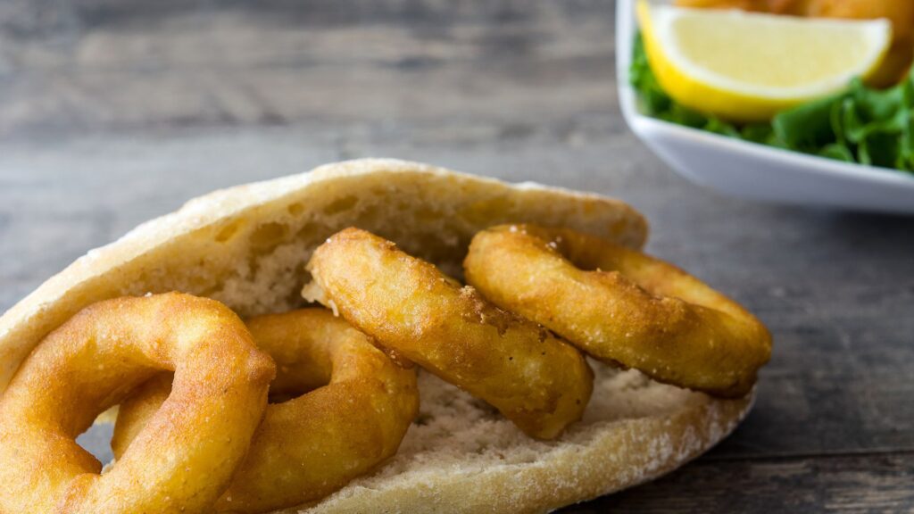 Bocadillo de calamares, den berömda bläckfiskmackan, är ett måste på en resa till Madrid, särskilt i närheten av Plaza Mayor där den har serverats i generationer. Rätten består av friterade bläckfiskringar i ett krispigt bröd, ofta med en skvätt citron eller majonnäs för extra smak. Det enkla receptet är ändå fulländat, och kombinationen av krispighet och saftighet gör varje tugga till en klassiker. Den serveras ofta som street food eller på små taverner, vilket gör den perfekt för en snabb lunch medan du utforskar stadens torg och historiska gator.