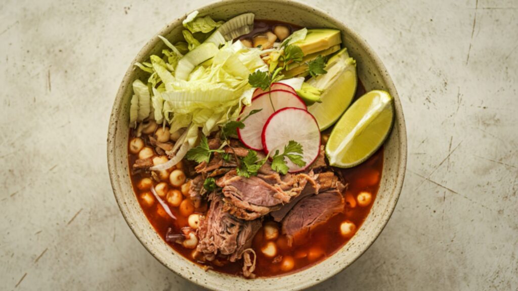 Pozole är en traditionell mexikansk soppa med djupa historiska rötter, ofta förknippad med fest och högtider, men också mycket populär i vardagen i Mexico City. Basen består av hominy-majs, långkokt tillsammans med kött – vanligtvis fläsk eller kyckling – som får dra åt sig smakerna från kryddor, lök och vitlök. Soppan serveras med färska tillbehör såsom strimlad sallad, riven radish, lime, koriander, lök och ibland hackad chili, vilket gör varje skål både färgstark och smakrik. Pozole finns i tre klassiska varianter: röd, grön och vit, där de olika salsorna ger subtilt olika karaktär.